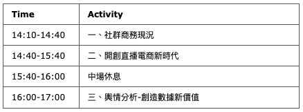 為了徹底熟悉這些與我們生活最緊密卻又隱形在身邊的社區網絡,將由奇寶總經理來與大家分享何謂社群商務還有五大社群平台的現狀,還特別請到了資深的兩位創辦人分析社群商務功能-「直播電商」與「輿論分析」,讓您貫徹社群網絡的實戰力!